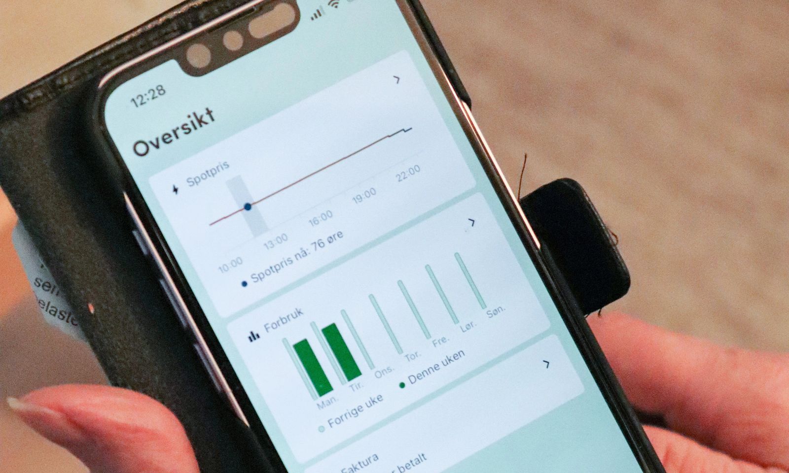 Smilet er alltid til stede, det samme er telefonen. Med kjappe tastetrykk henter vertinnen opp Lyse-appen. I den blar hun seg enkelt fram til en graf med spotprisen nå, resten av dagen og i morgen. Grafen gjør et lite byks mellom klokken 17 og 19.