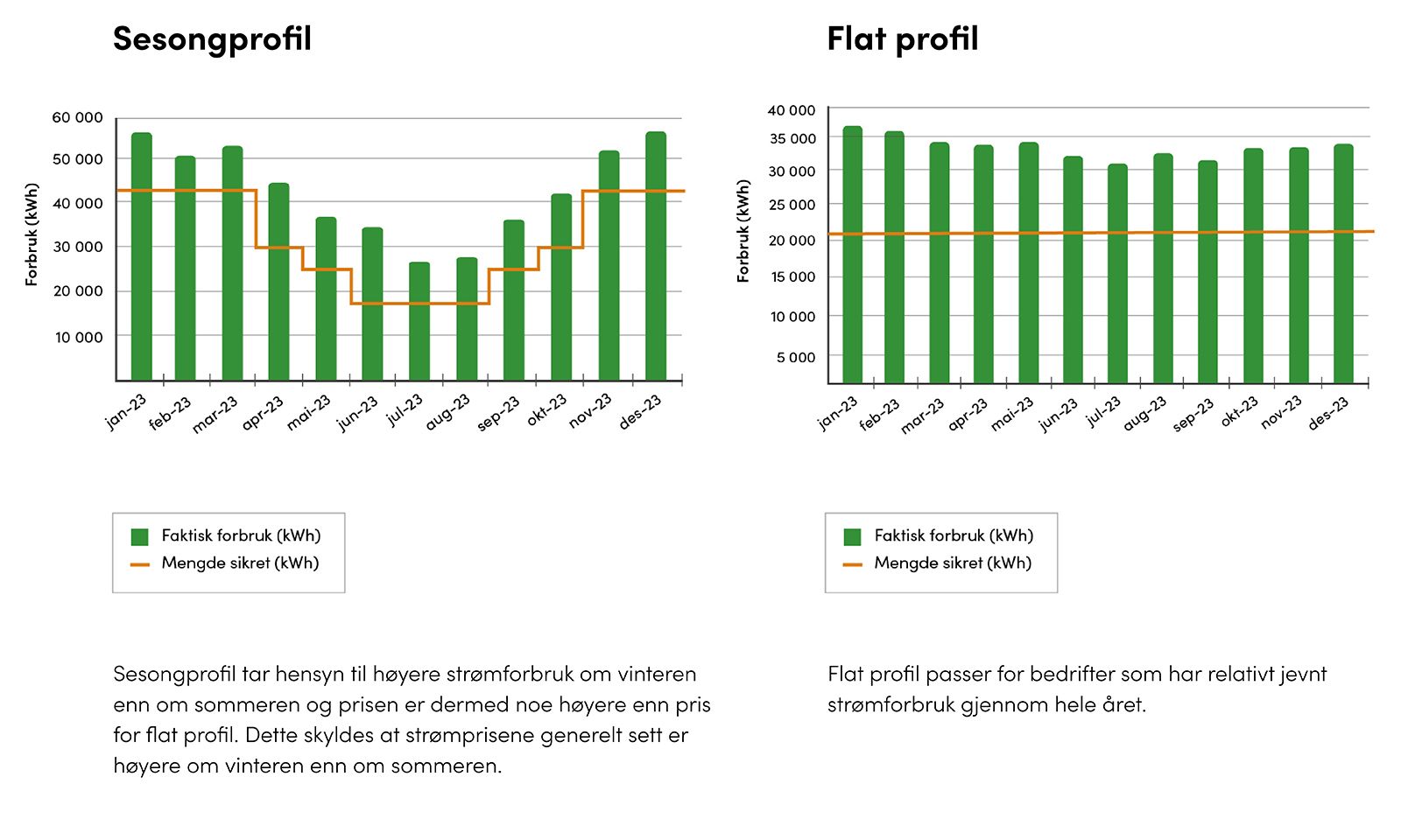 Prisene er vist for flat profil og sesongprofil og inkluderer påslag og lovpålagte el-sertifikat. Avtalene gjelder for tre, fem eller syv år, og bedriften kan binde opp til 90 % av det forventede totale forbruket.