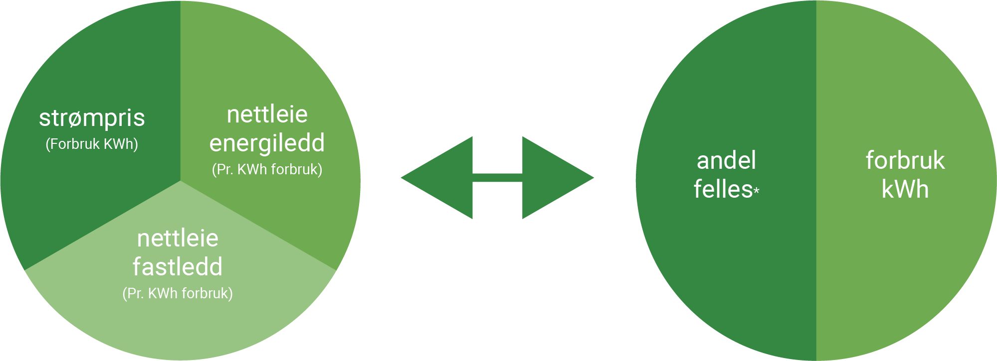 * Andel felles er den energien som blir brukt for å levere fjernvarme fra hovedmåler på eiendommen og frem til måler i de ulike eierseksjonene og eventuelt forbruk i fellesarealer.