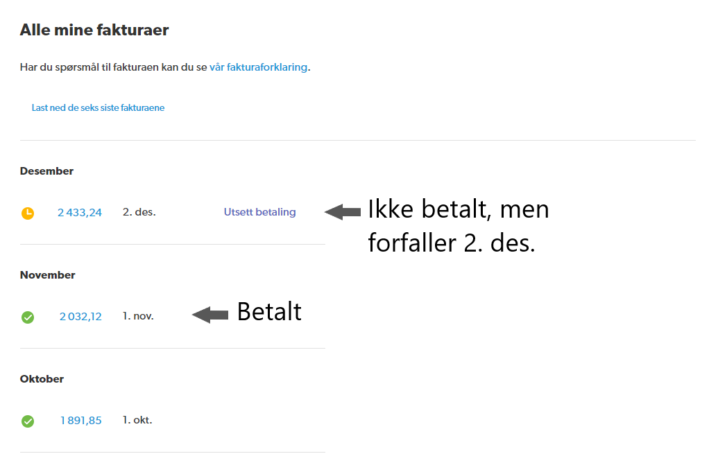 Sist oppdatert for 2 måneder sidenLurer du på om en faktura er betalt eller ikke? Dette kan du enkelt sjekke på Min Side eller i Lyse-appen. En grønn sjekkboks betyr at fakturaen er betalt. En gul klokke betyr at den ikke er forfalt enda.