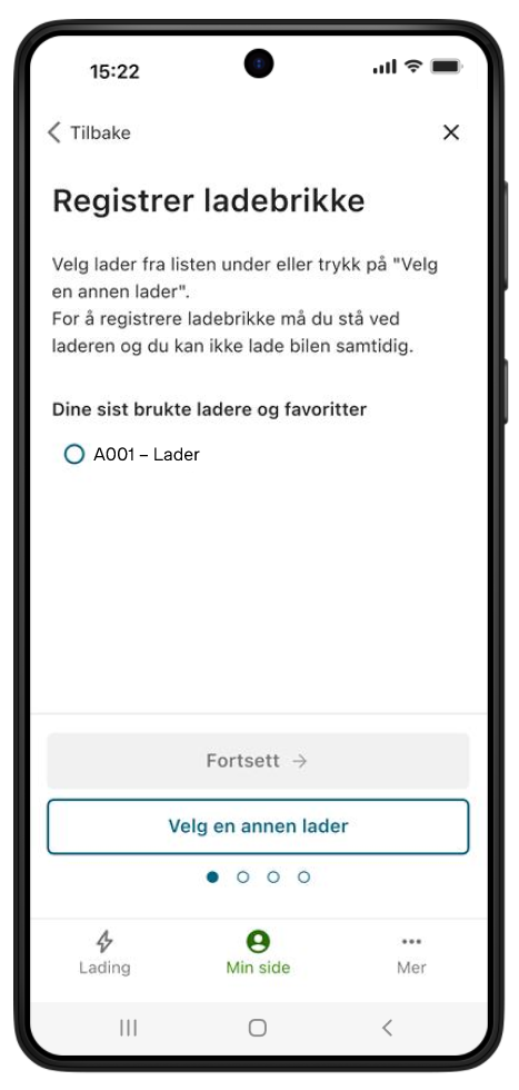 Sist brukte ladere kommer opp i en liste under. Velg ønsket lader, eller trykk "Velg en annen lader" og legg inn koden til laderen (som du finner på laderen).