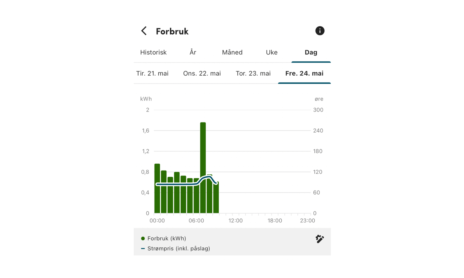 I forbruksgrafen vil dagsvisning oppdateres løpende utover dagen. For uke- og månedsvisning vil du kunne se forbruksøylen vokse.