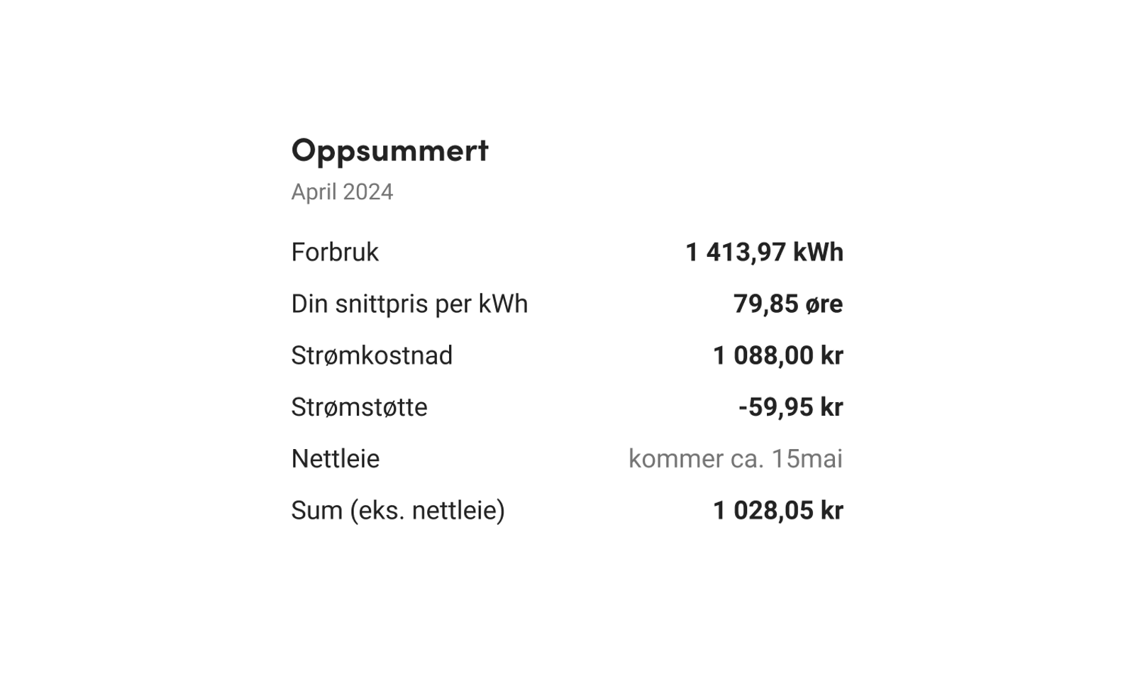 Strømkostnad er forbruk ganger din snittpris. Eventuell månedsavgift og vannkraftgaranti er ikke medregnet.