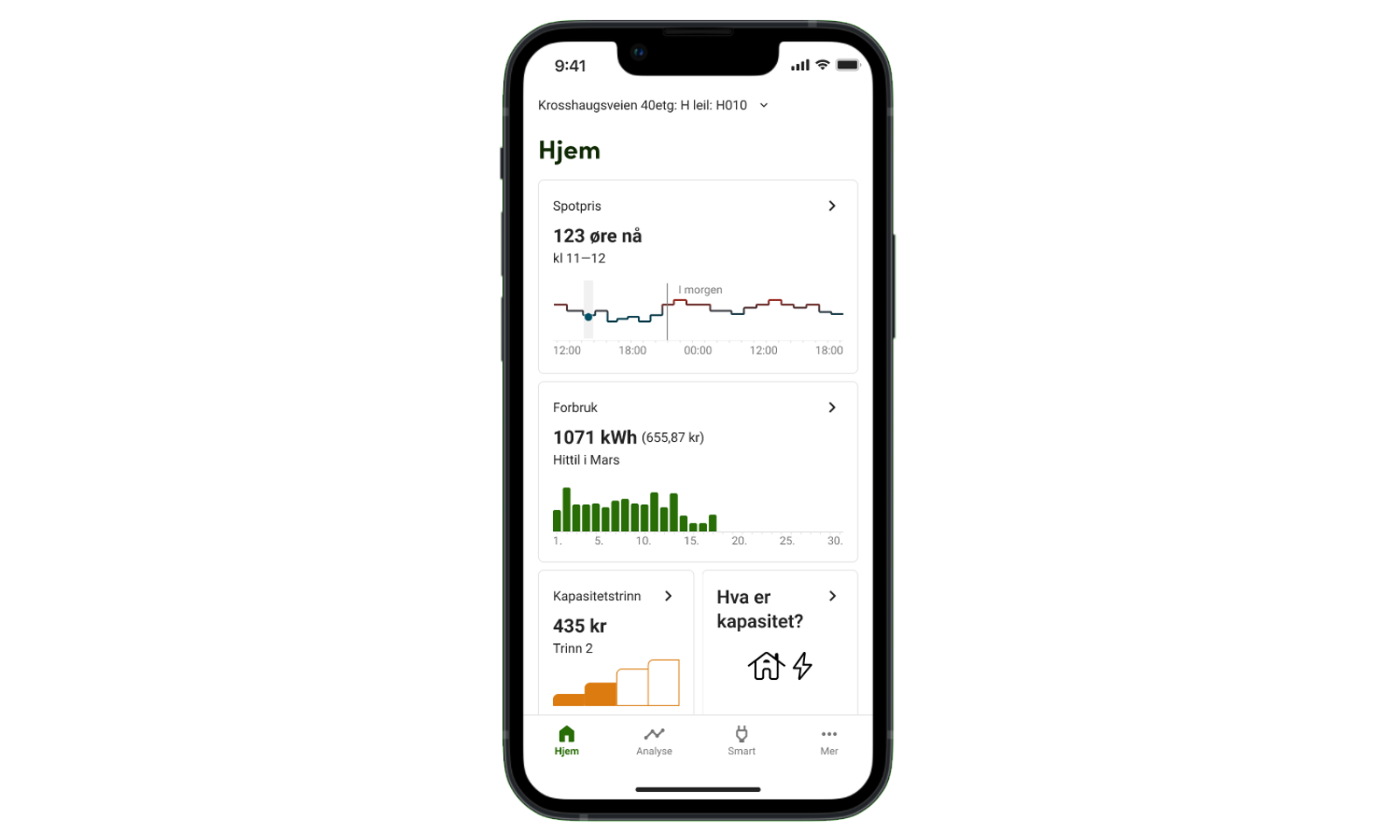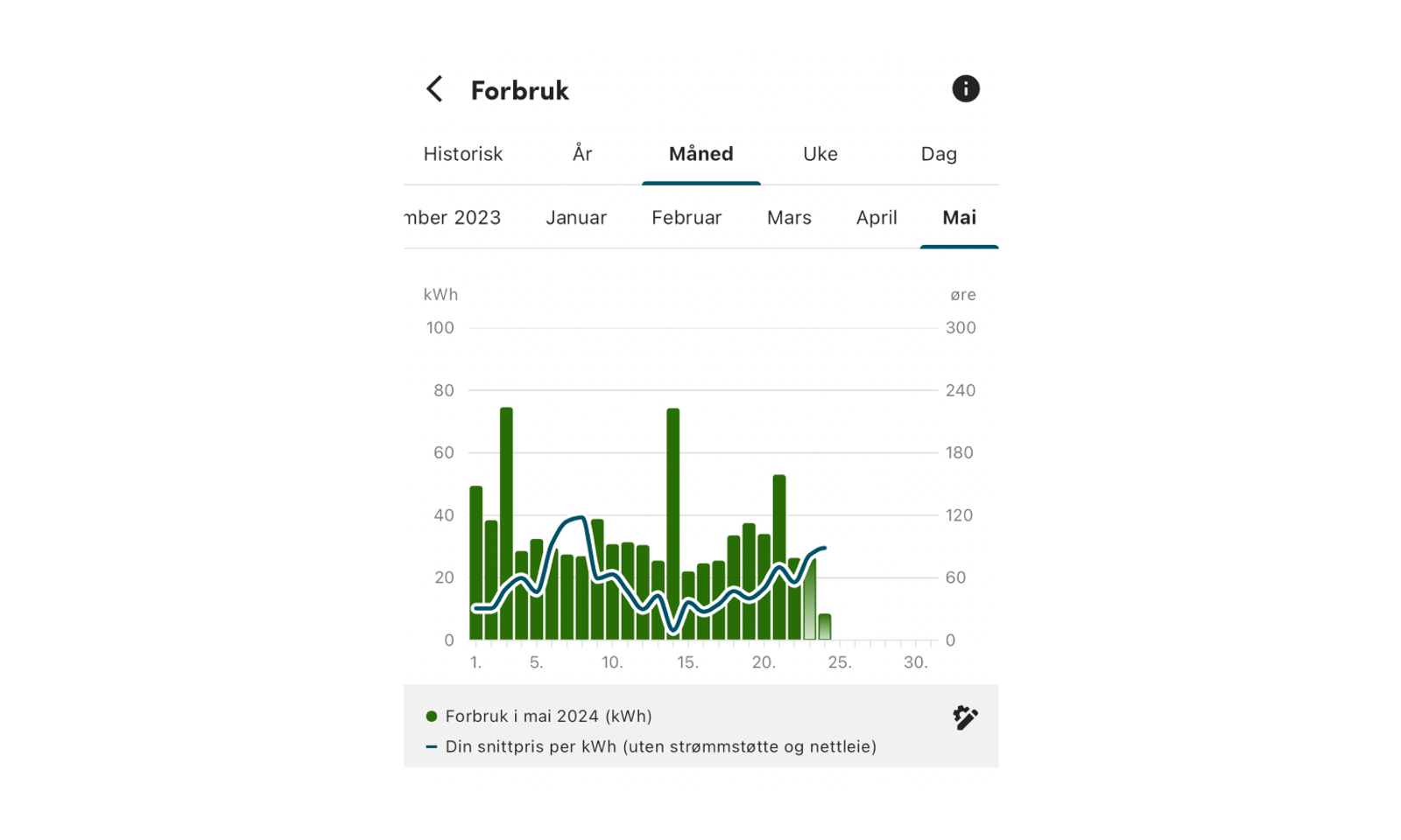 I appen har du full oversikt over strømforbruket ditt. Du kan følge med på hvor mye strøm du bruker hver time og hvilke dager/tidspunkt du bruker mest.