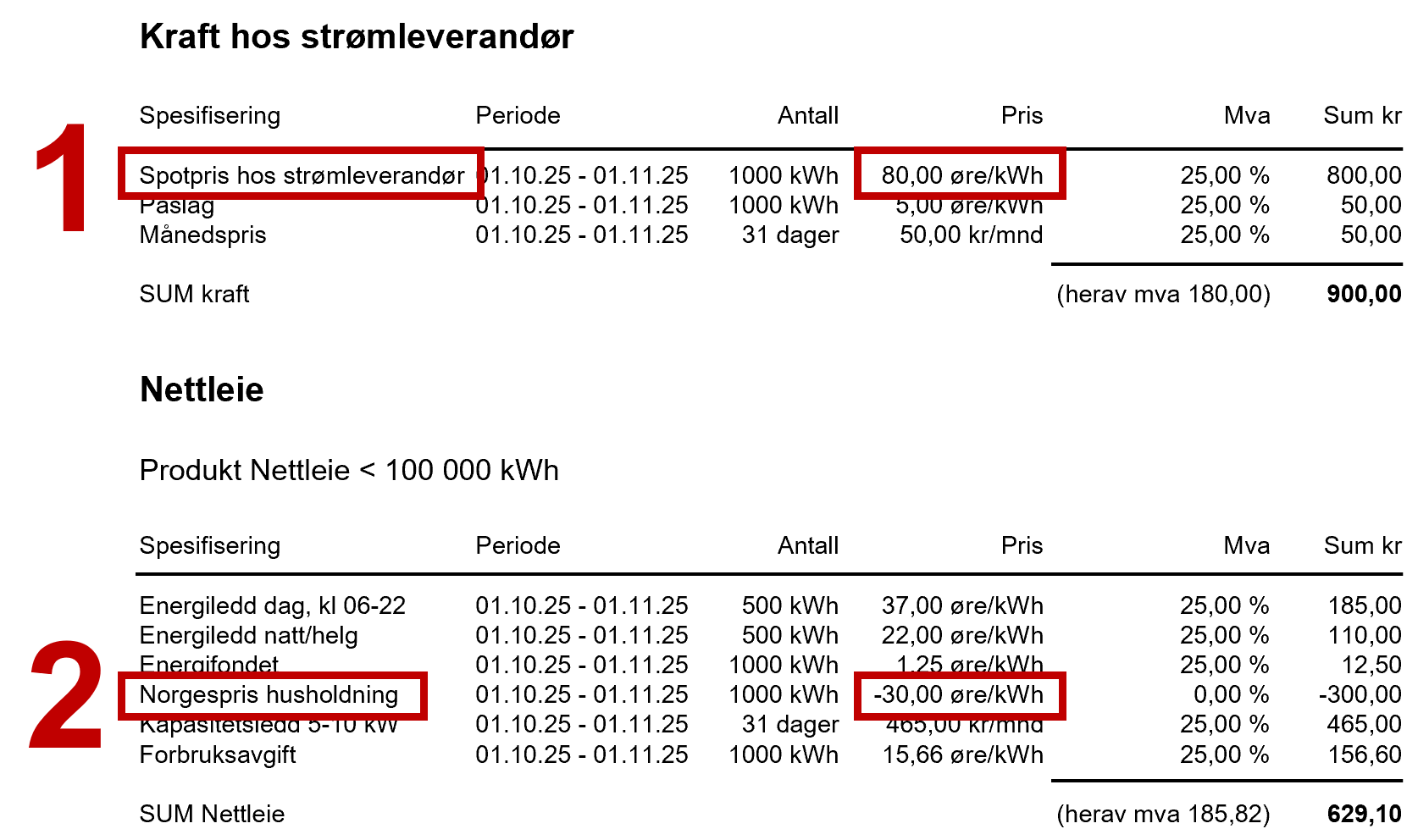 Hvis strømprisen er 80 øre (1), betaler du 80 øre til strømleverandøren din, men du får 30 øre tilbake (2) på nettleia.