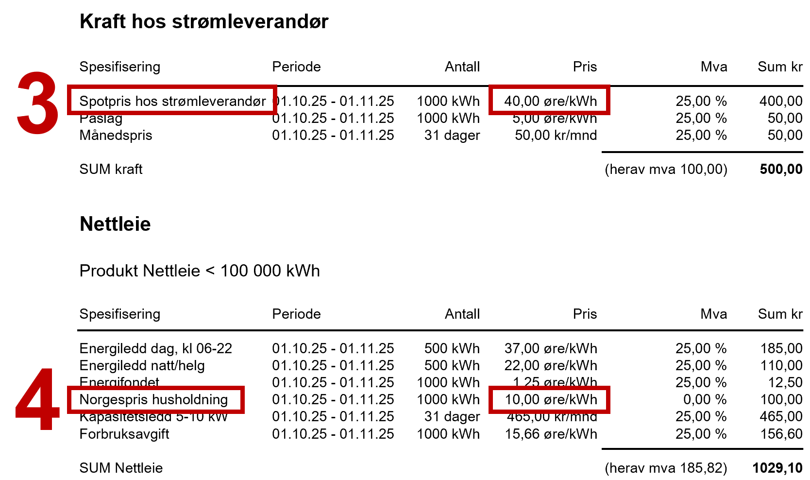 Hvis strømprisen er 40 øre (3), betaler du 40 øre til strømleverandøren din. Da legger nettleverandøren på 10 øre (4) til på nettleia.